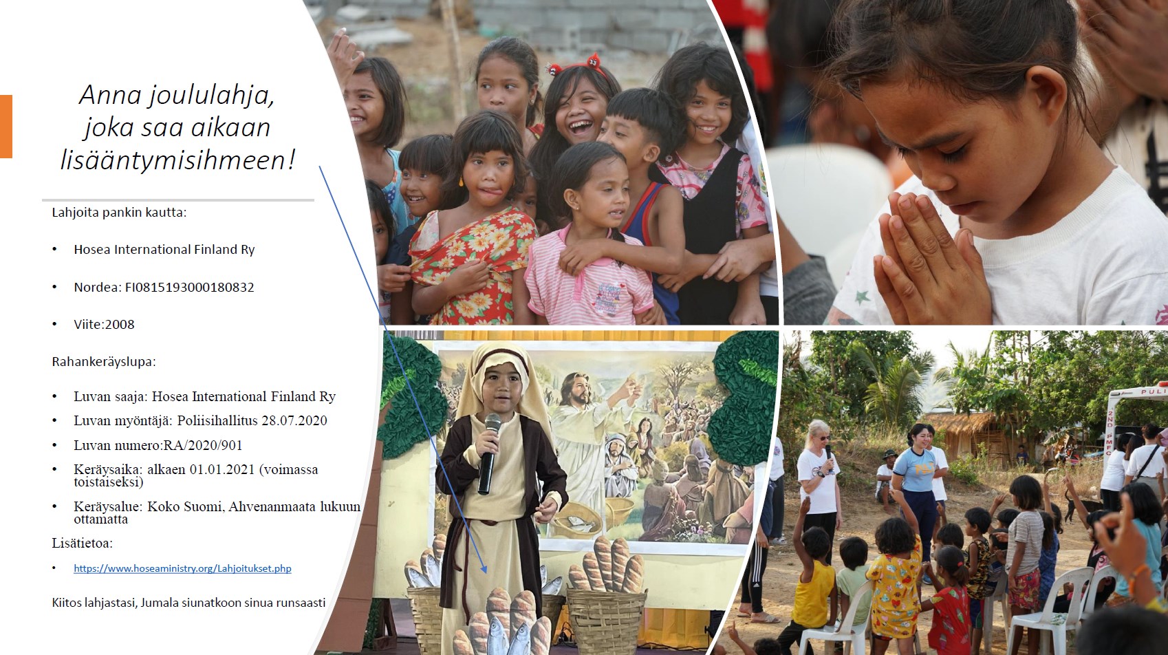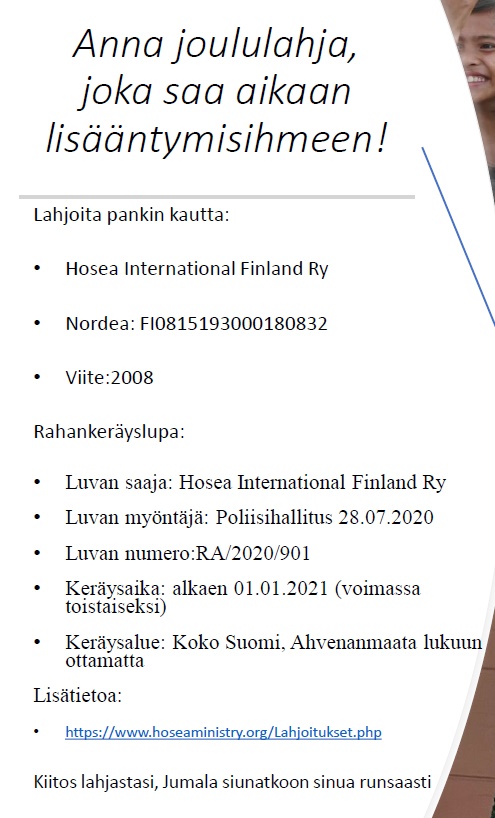 Hosea-seurakunta on jälleen pitänyt kastetilaisuuden. Usein ulkopuoliset tulevat vain kuuntelemaan, mitä meillä tapahtuu. Sitten he tuovat muuta perhettä mukanaan, ja näin heitä tulee uskoon, mitä seuraa kastetilaisuus. Seurakunnan jäsenet pitävät siitä, että he saavat olla aktiivisesti kaikessa mukana, myös julistamassa evankeliumia tiimeinä eri alueille. Näin työstä tulee yhteinen asia!